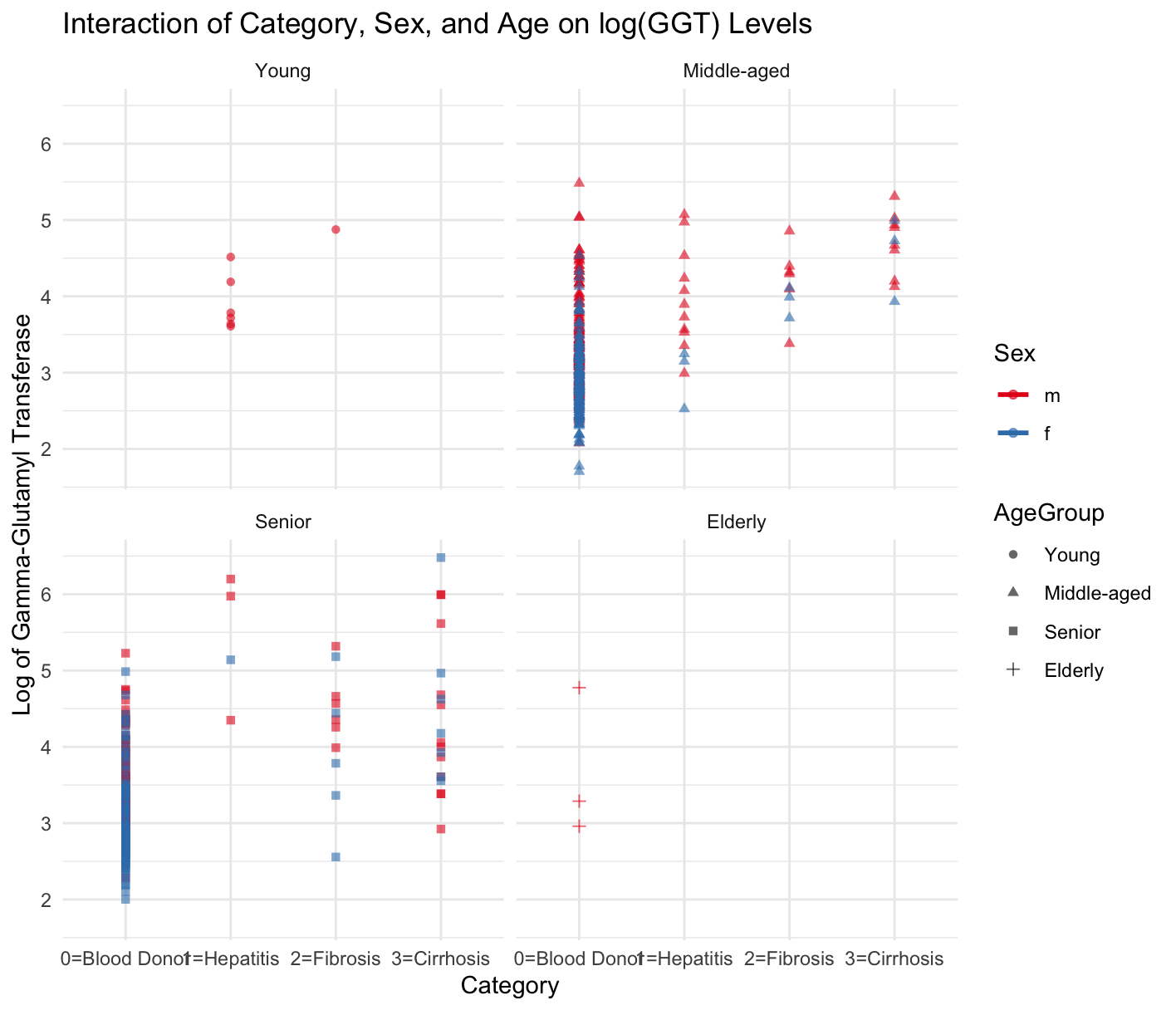 ANOVA and Multiple Regression Models: To assess the influence of gender on liver enzyme levels, we utilized these statistical methods. These models helped us quantify the differences and also explore potential interactions with age, which might modify how gender influences these biochemical markers.