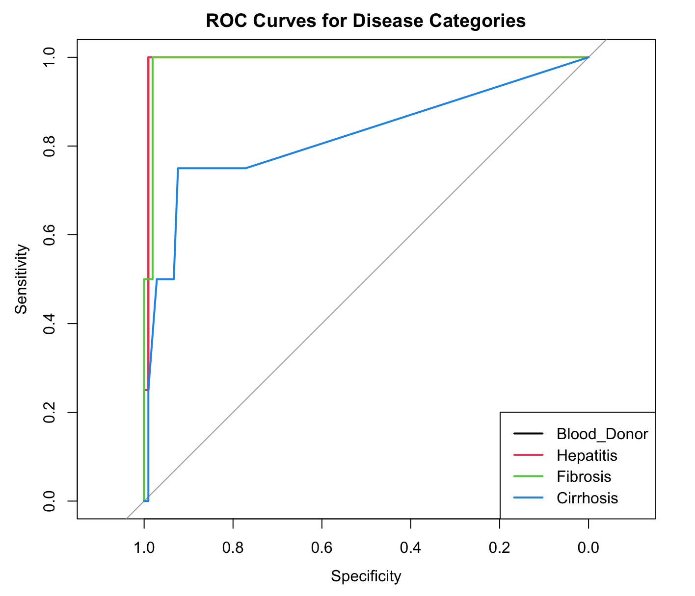 Accuracy Metrics: The Random Forest model achieved notable area under the ROC curve (AUC) scores for differentiating between disease stages with Blood Donor (0.99), Hepatitis (0.99), Fibrosis (0.99), and Cirrhosis (0.82). Similarly, the SVM model showed AUC scores of Blood Donor (0.99), Hepatitis (1.00), Fibrosis (0.99), and Cirrhosis (0.99).