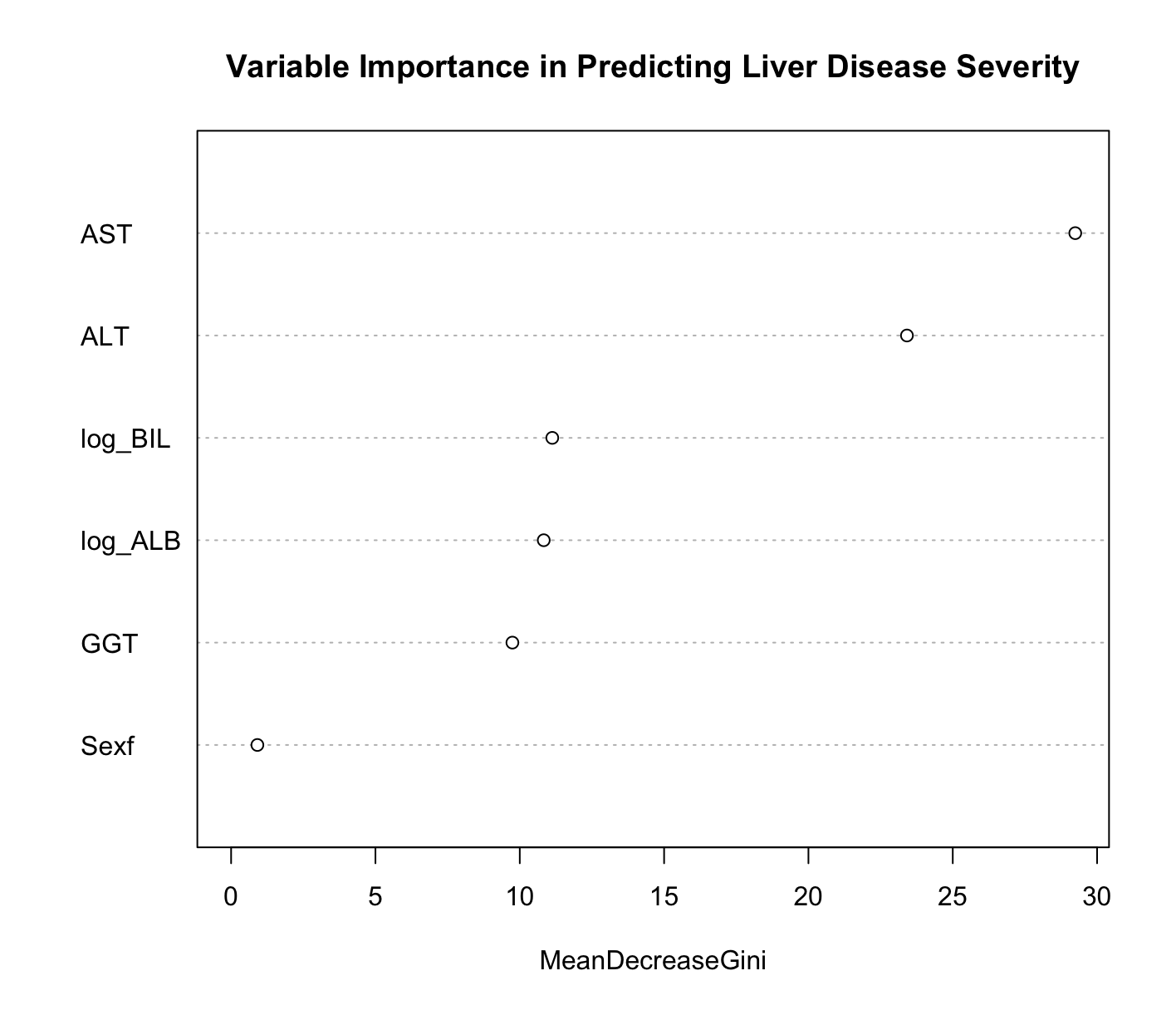 Variable Importance Plot: Shows which variables are most influential in predicting disease severity. This insight is key for understanding what factors are most critical in the progression of liver disease.